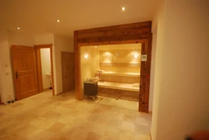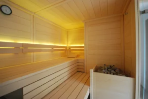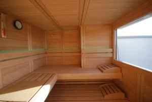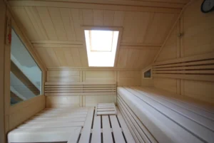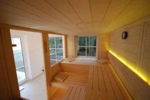 Für die individuelle Einzelanfertigung stehen uns 58 mm starke Blockbohlen zur Verfügung. Sämtliche Holzverbindungen und die Verarbeitung sind in handwerklicher Perfektion ausgeführt. Alle Merkmale in punkto Ausstattung und räumlicher Gestaltung sind identisch mit unseren Element- bzw. Massivsaunen. Dachschrägen, Fenstereinbau und Ganzglas-Elemente lassen sich problemlos in Ihre Wunschsauna integrieren.